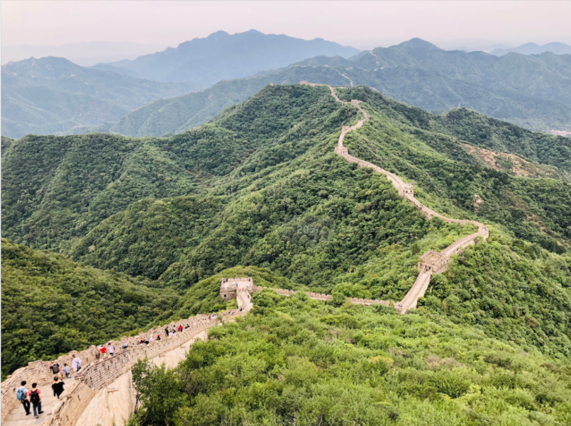 進入景區后,我們穿行了一段林間,到達了烽火臺。放眼望去,長城仿佛一條飽經滄桑、時刻準備騰飛的巨龍,它凝聚著中華民族的血脈,象征著華夏兒女的氣概,正如《長城贊》中“跨峻嶺,穿荒原,橫瀚海,經絕壁”的“壯麗奇觀。