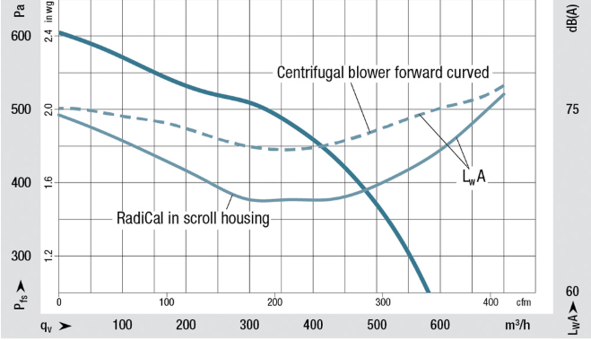 蝸殼型離心風機的外殼上有一個橫截面為圓形的出風口,可直接連接到機組出風管道上。與類似離心鼓風機相比,它減少了流量損失,壓力的變化對空氣動力性能的影響很小,效率提高了34%,而噪音排放降低了約3.5 dB(A),從而為住戶提供更加安靜的室內居住環境。