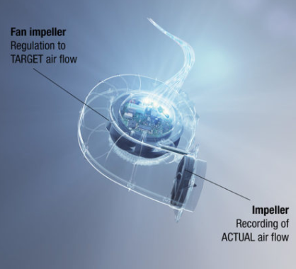 蝸殼型RadiCal離心風機集成了可測量空氣流速的葉輪風速計,可持續測量實際空氣流量,并將數據反饋到風機的集成中央電子控制系統。該控制電子系統根據設定值調節EC 電機的轉速,進而起到調節風量的作用。借助風速計,空氣流量可在風機的性能范圍內,以±1%的精度進行調節,從而實現恒風量控制。