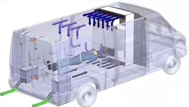 在整輛車中,“負(fù)壓隔離”的是救護(hù)車后部的醫(yī)療艙。在這里,系統(tǒng)通過空調(diào)和風(fēng)機(jī)采用流體力學(xué)的原理,在車內(nèi)形成從潔凈區(qū)(即車內(nèi)乘坐姿態(tài)較高的醫(yī)護(hù)人員區(qū)),到傳染源區(qū)(即躺在擔(dān)架上的病人區(qū))的定向氣流。最終,車內(nèi)氣體將將通過過濾器消毒后排出車外,不會(huì)進(jìn)入車內(nèi)再循環(huán)。