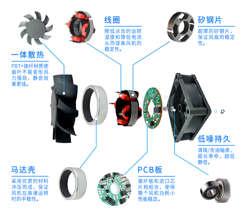 DC(Direct Current,直流)風(fēng)機(jī)指的是使用直流電源驅(qū)動的風(fēng)機(jī),其電機(jī)通常是有刷或無刷直流電機(jī)。直流電源的電壓和電流波動較大,因此DC風(fēng)機(jī)的輸出功率和機(jī)械效率相對較低,但可實(shí)現(xiàn)更高的轉(zhuǎn)速和更小的尺寸。同時,DC風(fēng)機(jī)在低速、低負(fù)載運(yùn)行時具有很好的扭矩性能和控制性能,應(yīng)用于電腦、通信設(shè)備、電動工具和小型家電等領(lǐng)域。