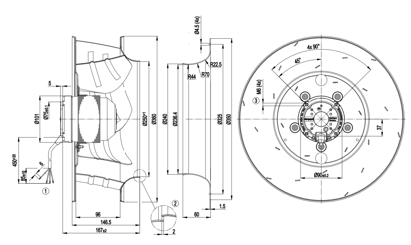 風機定子有4個M6的固定孔,孔深為16mm,選擇螺栓時注意該尺寸,避免風機安裝不牢固。