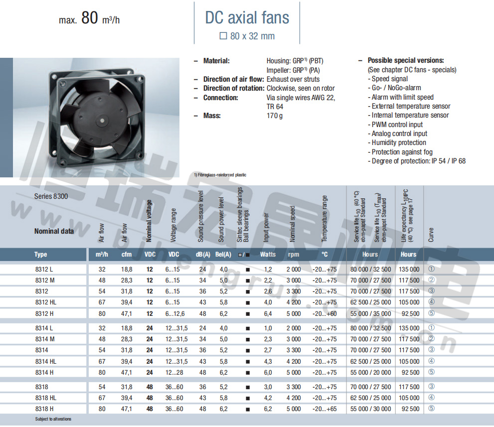 8312H風量:80m³/h 電壓:12v 噪音:48Db 功率:6.4W 轉速:5000r/min