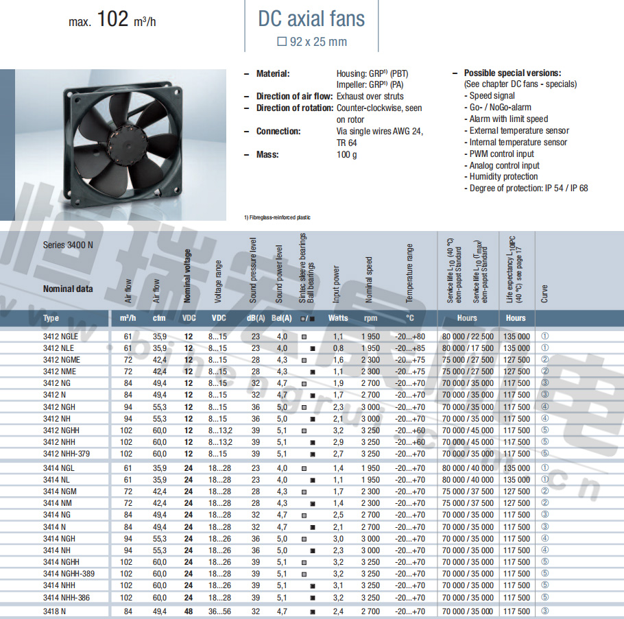 緊湊軸流風機□92×25 mm max.102 m3/h 3412NGLE 3412NLE 3412NGME 3412NME 3412NG 3412N 3412NGH 3412NH 3412NGHH 3412NHH 3412NHH-379 3414NGL 3414NL 3414NGM 3414NM 3414NG 3414N 3414NGH 3414NH 3414NGHH 3414NGHH-389 3414NHH 3414NHH-389 3418N