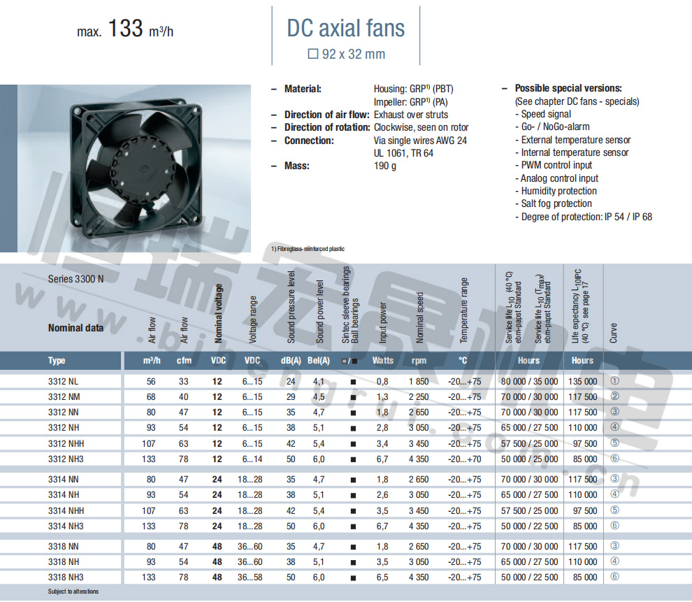 3314NH風量:93m³/h 電壓:24v 噪音:38Db 功率:2.6W 轉速:3050r/min
