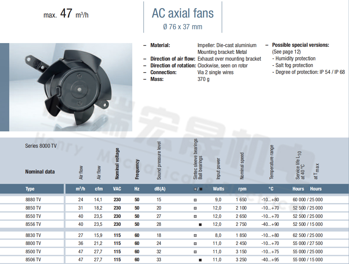 8830N風量:36m³/h 電壓:115v 電流:3.7A 功率:8W 轉速:1950r/min