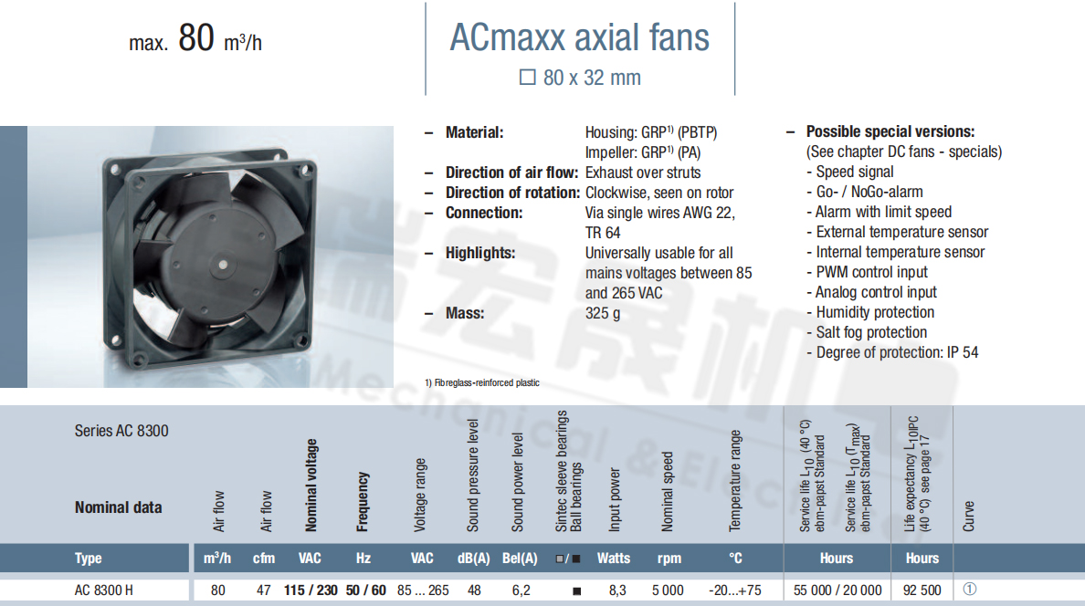 Aci4420HH風量:175m³/h 電壓:230v 電流:5.3A 功率:4.6W 轉速:3300r/min