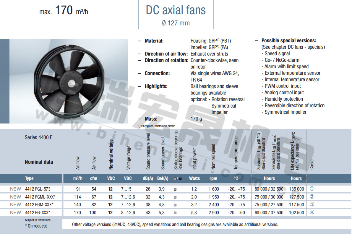 4412F 風量:170m³/h 電壓:12v 噪音:43Db 功率:5.3W 轉速:2900r/min