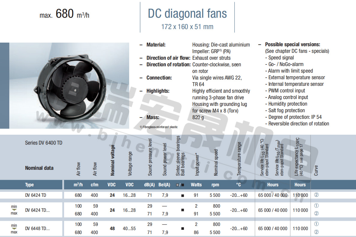 DV6448 風(fēng)量:530m³/h 電壓:48v 噪音:65Db 功率:40W 轉(zhuǎn)速:4300r/min