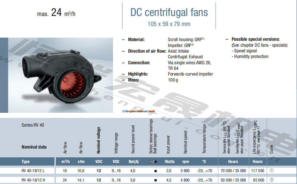 RV40-18/12H風量:24m³/h 電壓:12v 電流:5A 功率:4.5W 轉速:4800r/min