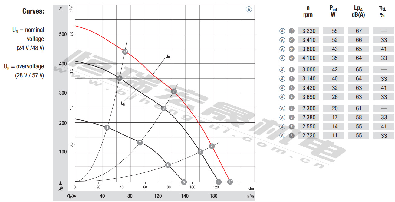 G1G160-BH39-52風量:505m³/h 電壓:48v 電流:2.9A 功率:105W 轉速:1750r/min