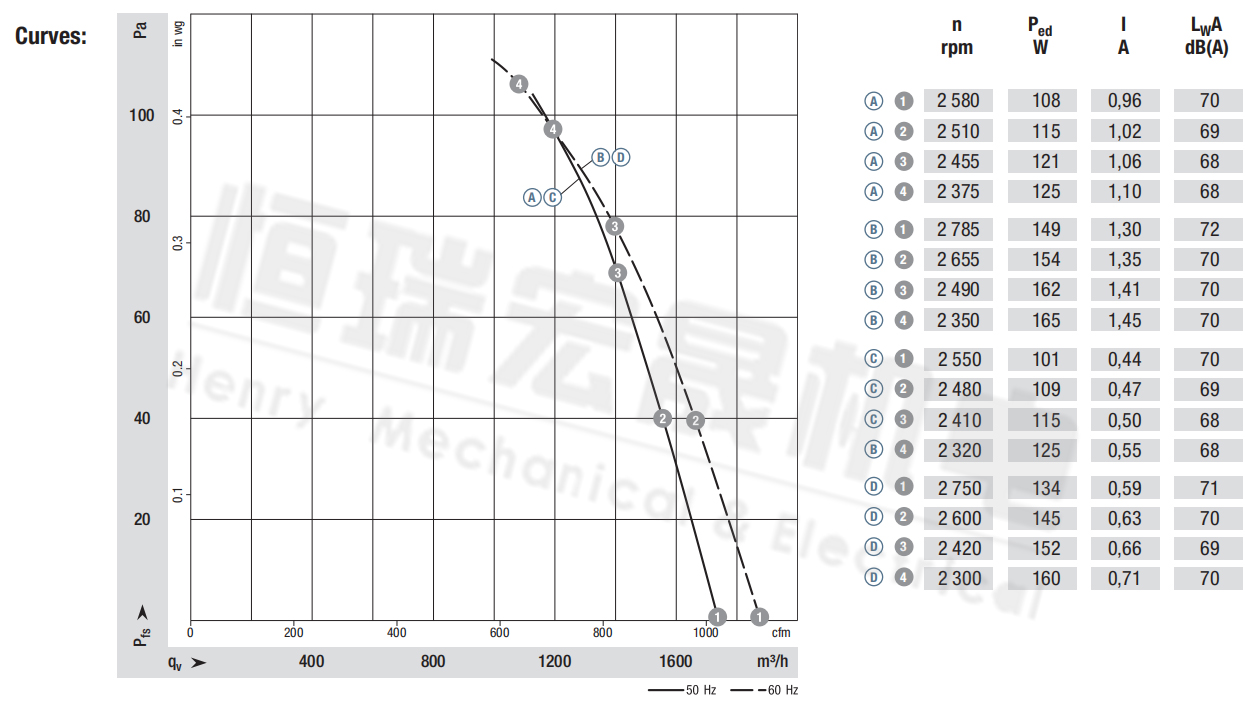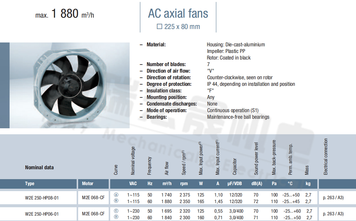 W2E250-HP06-01風量:1695m³/h 電壓:230v 電流:0.55A 功率:125W 轉速:2320r/min