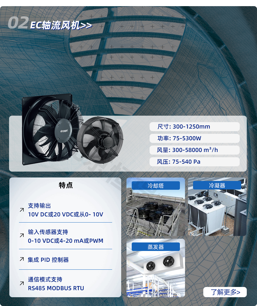 EC風機可確保冷卻塔節能、可靠、經濟地運行。